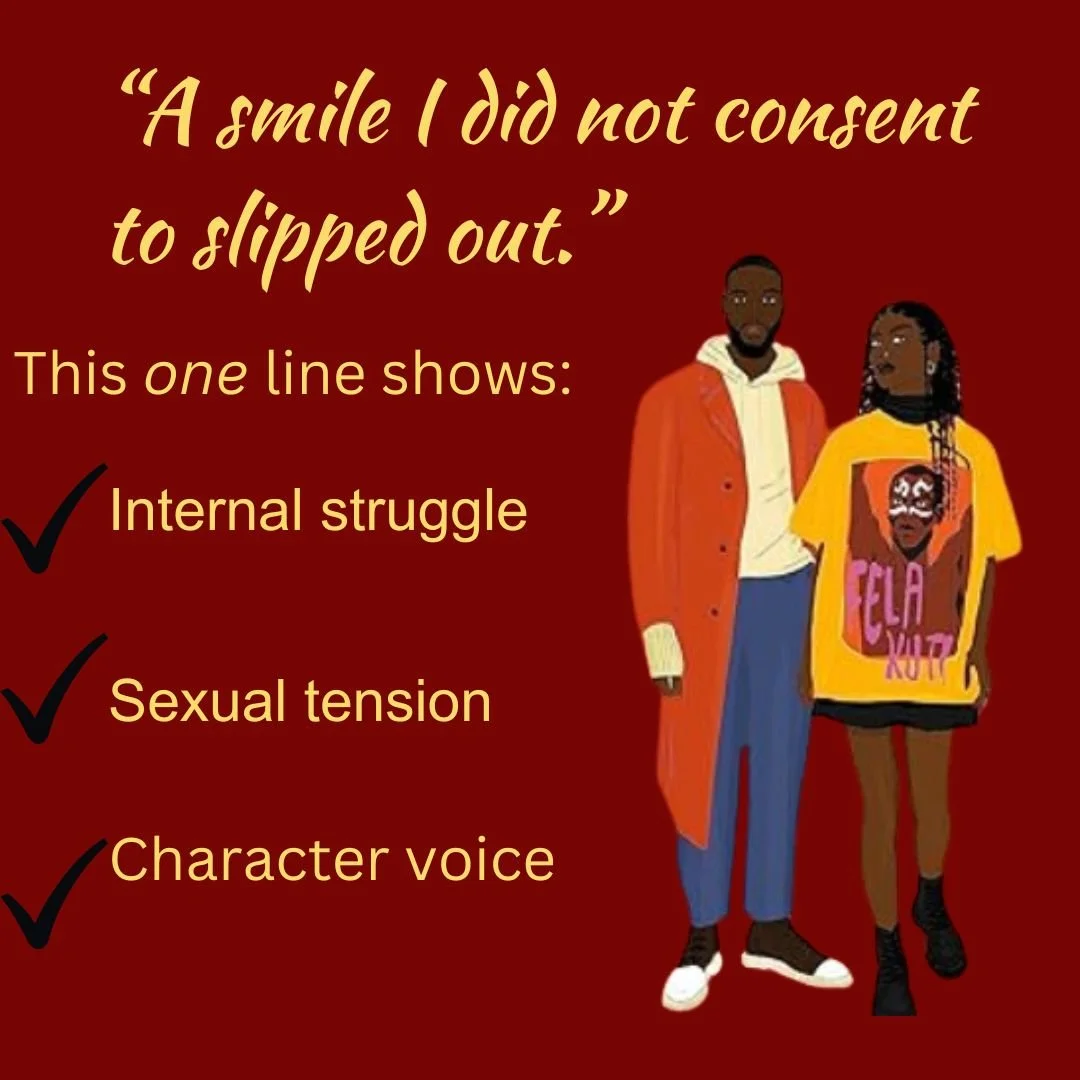 The biggest analytical take away from Honey and Spice is how Babalola shows the MC’s ‘emotional wound’ through personality, dialogue, the decisions she makes, the actions she takes. Kiki is not repeatedly explaining to the reader through internal narration how she must feel in control.